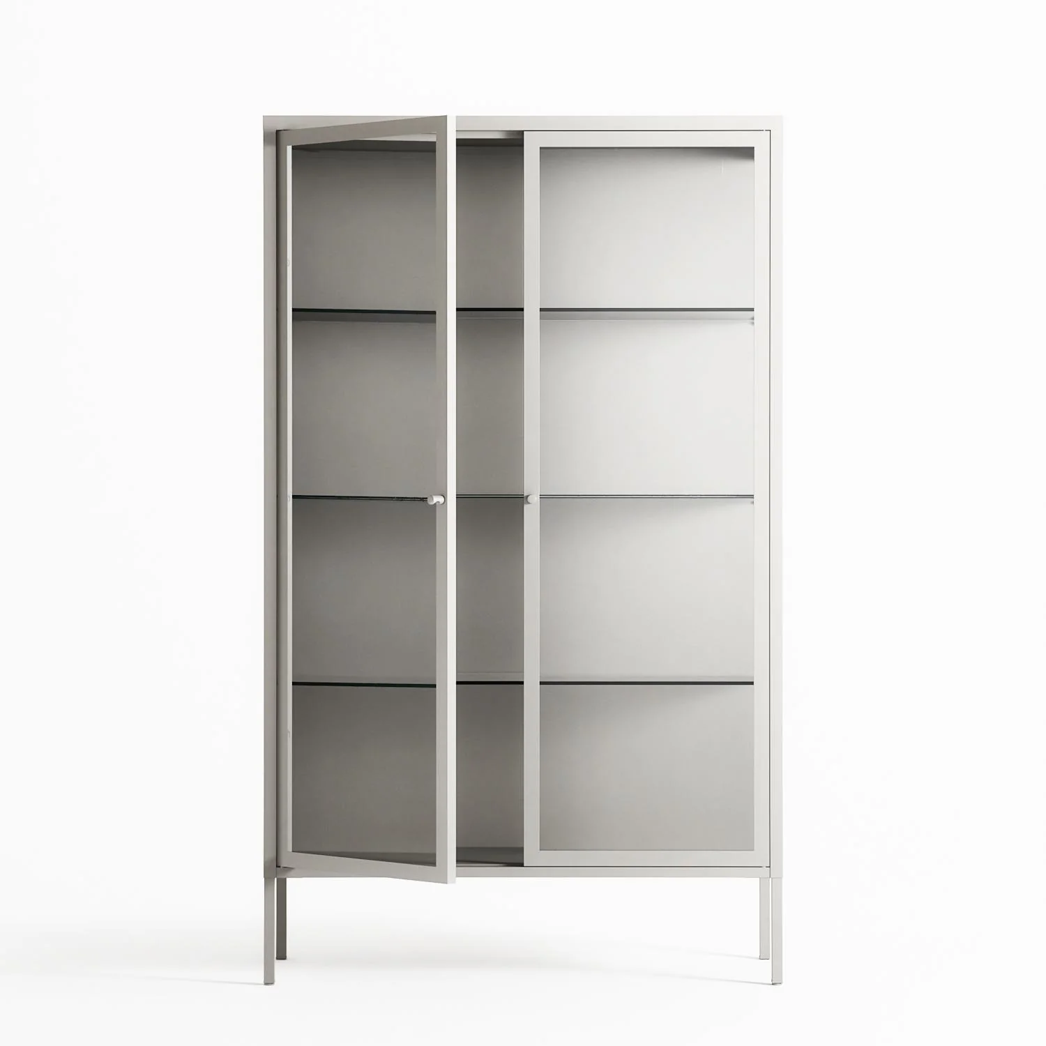 Vitrine is available in various sizes and in a range of colours and glass finishes. The cabinet is built from precision-cut metal with a powder-coated finish — resistant to wear and crafted for stability — making it ideal for both office and home spaces.