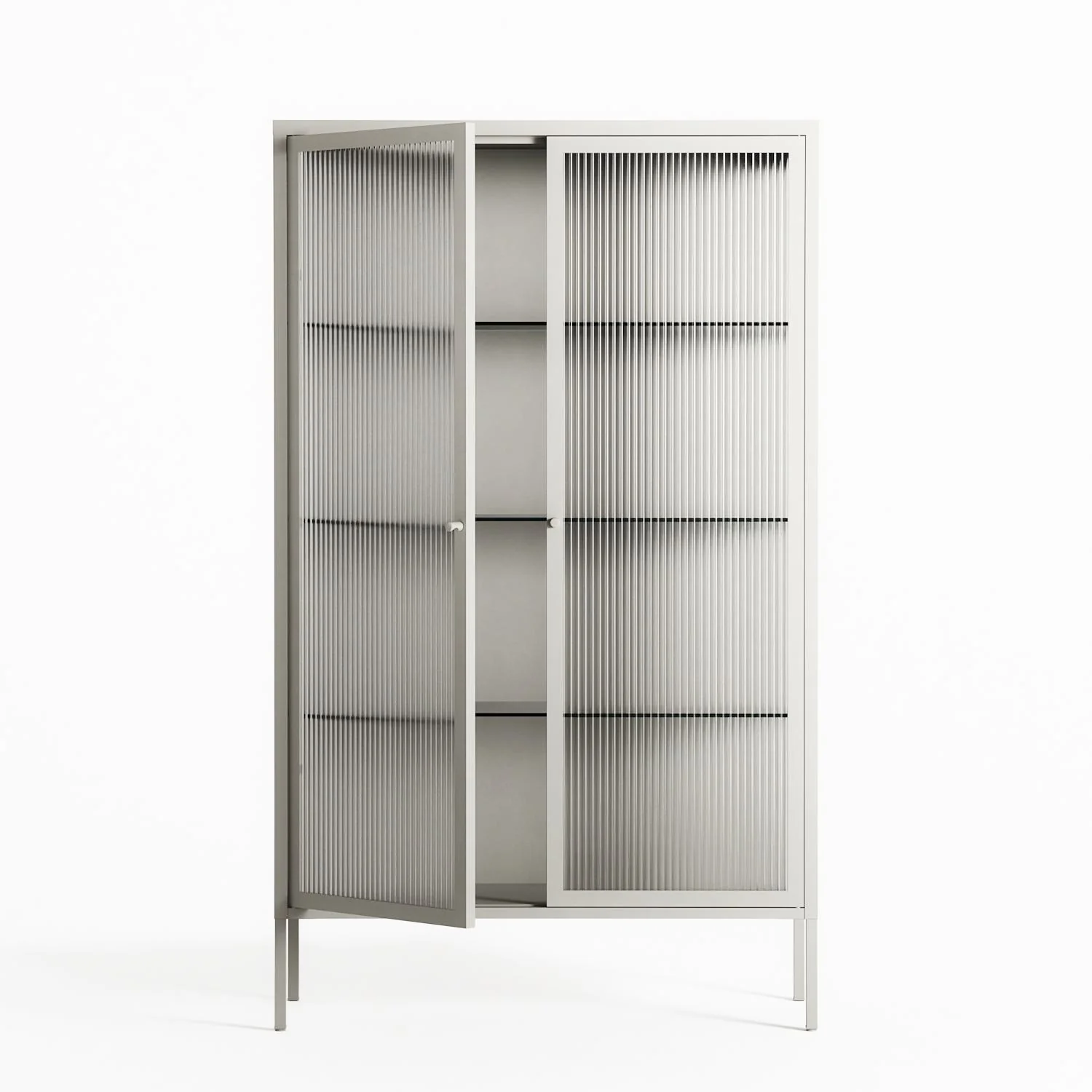 Vitrine display cabinet with reeded glass, finished in the colour Chalk. An iconic cabinet crafted with precision, built to last for generations. Its minimalist frame and reeded glass panels showcase the objects within.