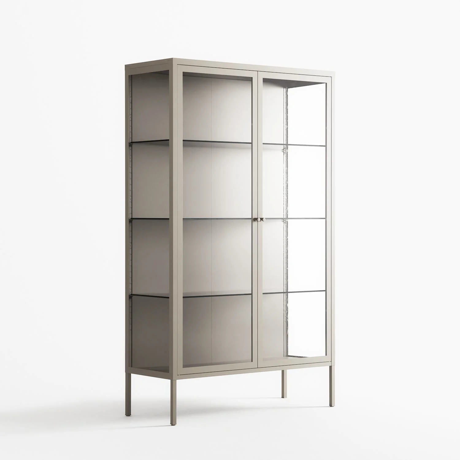 Vitrine display cabinet with clear glass, finished in the colour Pebble. An iconic cabinet crafted with precision, built to last for generations. Its minimalist frame and transparent glass panels showcase the objects within.