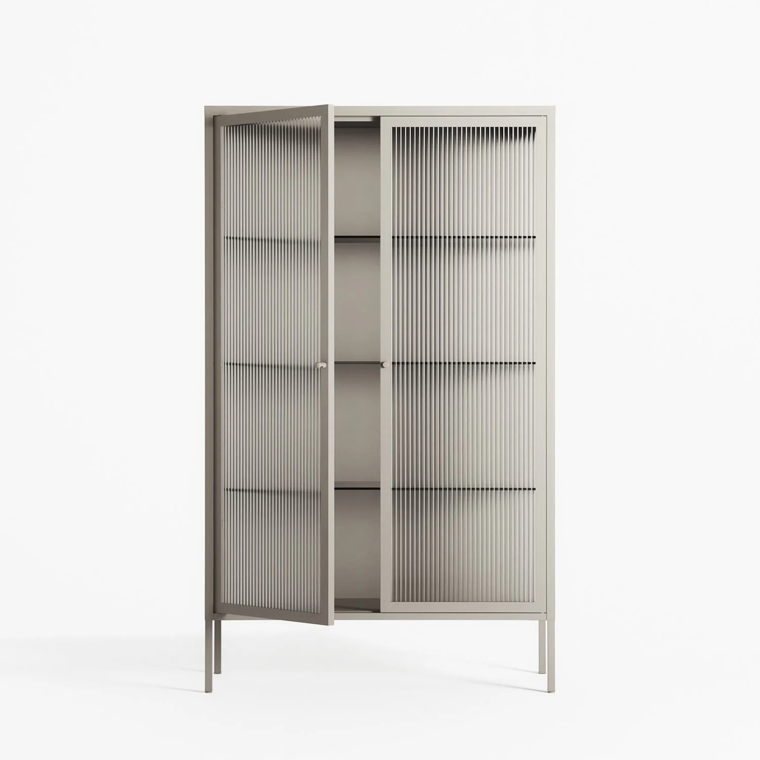 Vitrine display cabinet with reeded glass, finished in the colour Pebble. An iconic cabinet crafted with precision, built to last for generations. Its minimalist frame and reeded glass panels showcase the objects within.